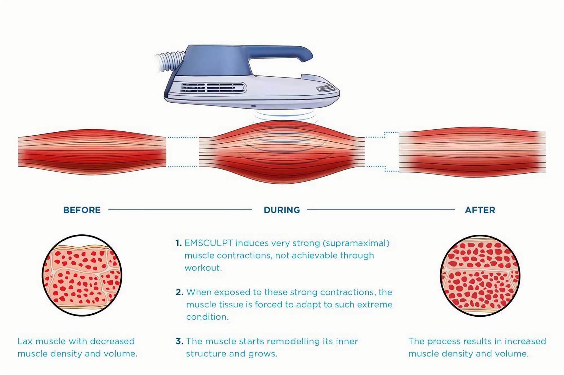 During an emsculpt session, the machine emits high-intensity electromagnetic waves that penetrate through the skin, targeting specific muscle groups. These waves prompt powerful and involuntary muscle contractions, known as supramaximal contractions. These contractions are substantially more intense than those achieved through traditional exercise routines, allowing the machine to exert muscles beyond the limits of ordinary workouts.