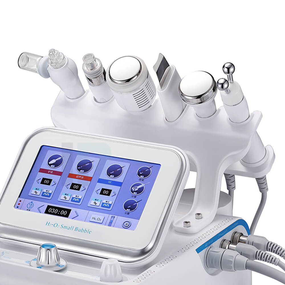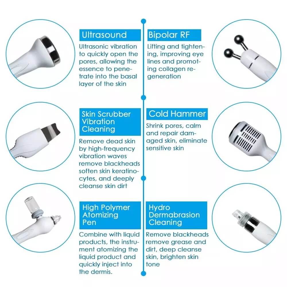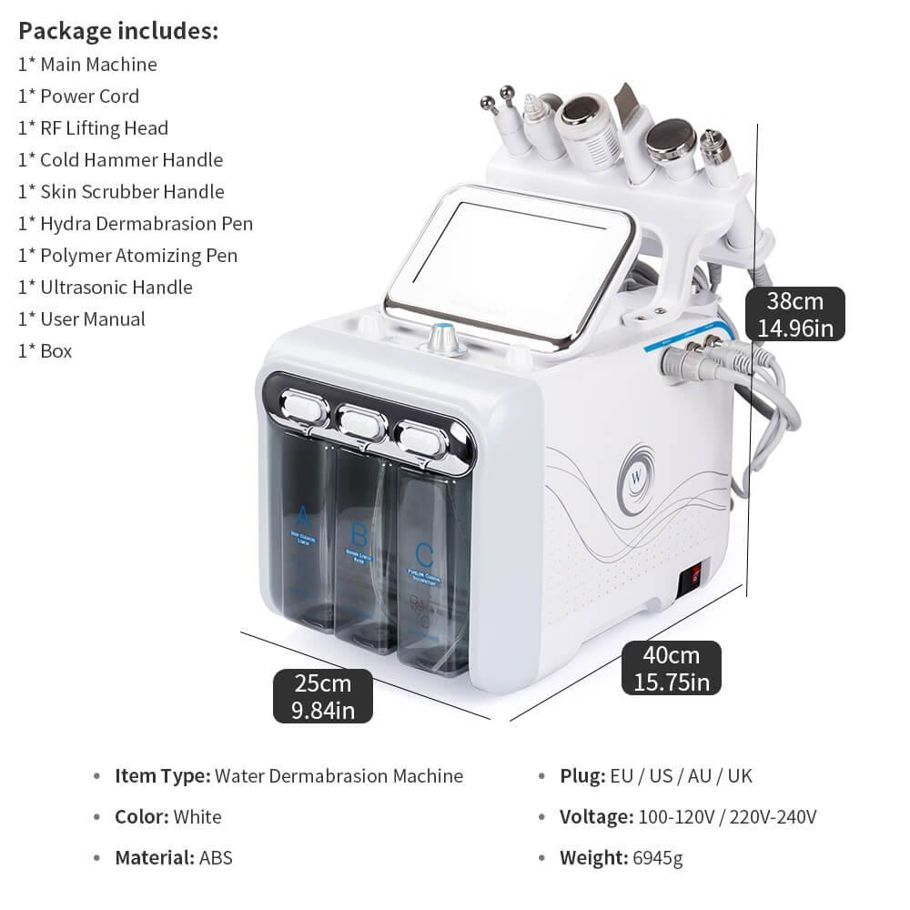 The 6-in-1 Hydrodermabrasion Machine combines hydro exfoliation, RF lifting, BIO microcurrent, and ultrasonic infusion to cleanse, hydrate, and smooth skin safely and effectively.
